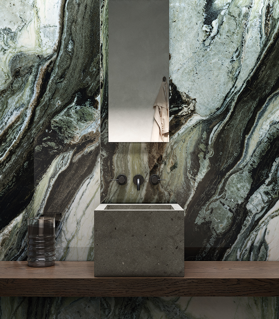 Bagno con espressive piastrelle in gres porcellanato effetto marmo