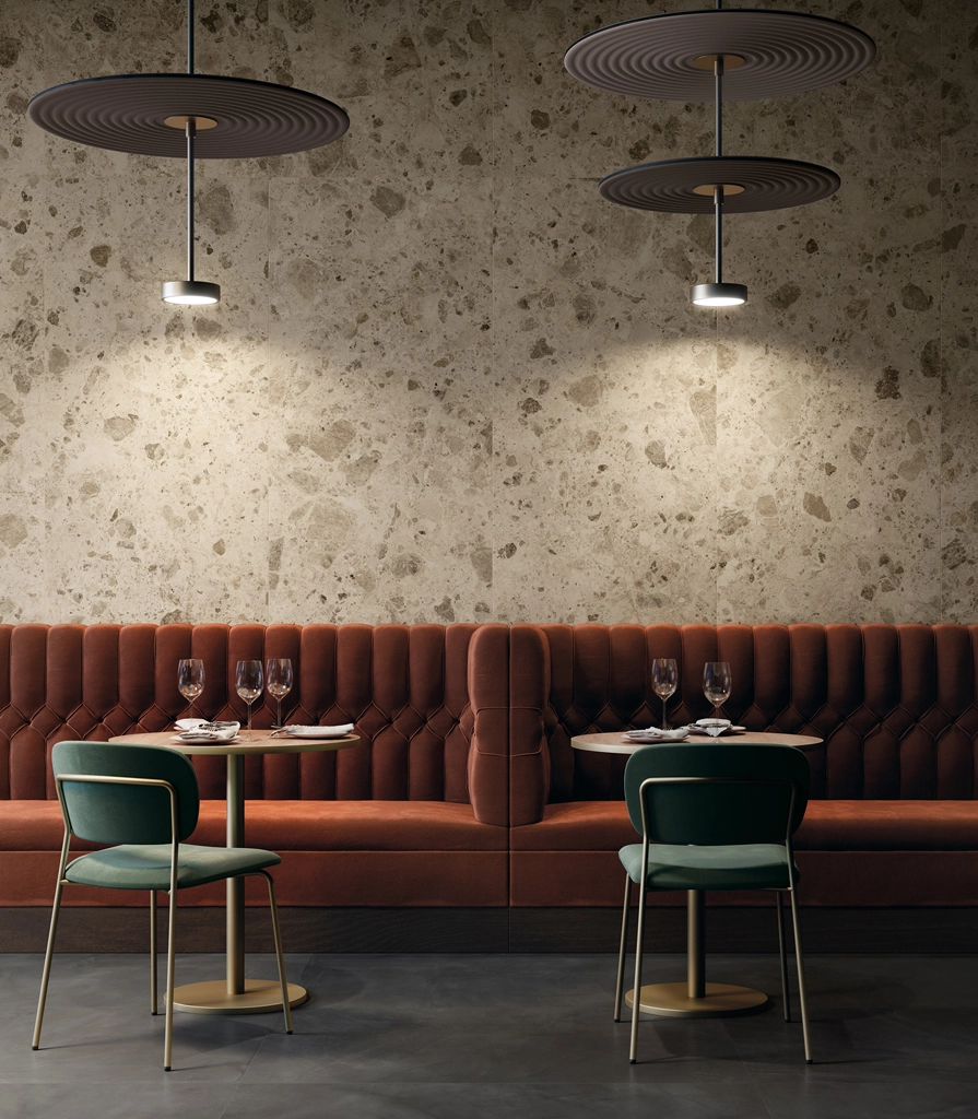 I toni scuri del Petrol creano una avvolgente atmosfera urbana adatta a spazi commerciali dal look metropolitano. In abbinamento alle tonalità calde dello Stone Beige: un mix chiaroscuro di assoluta eleganza.