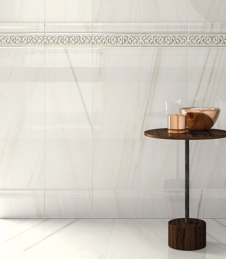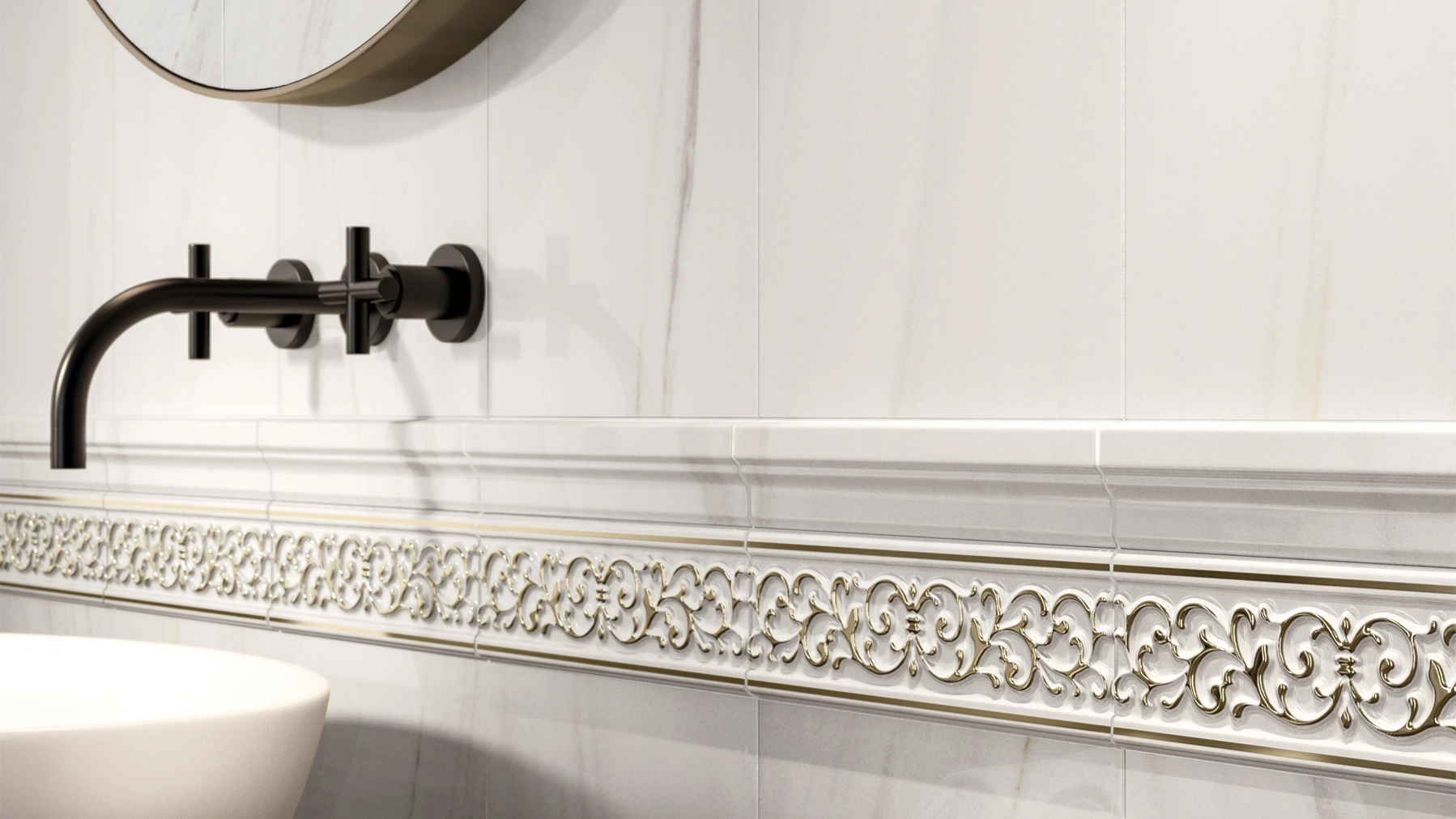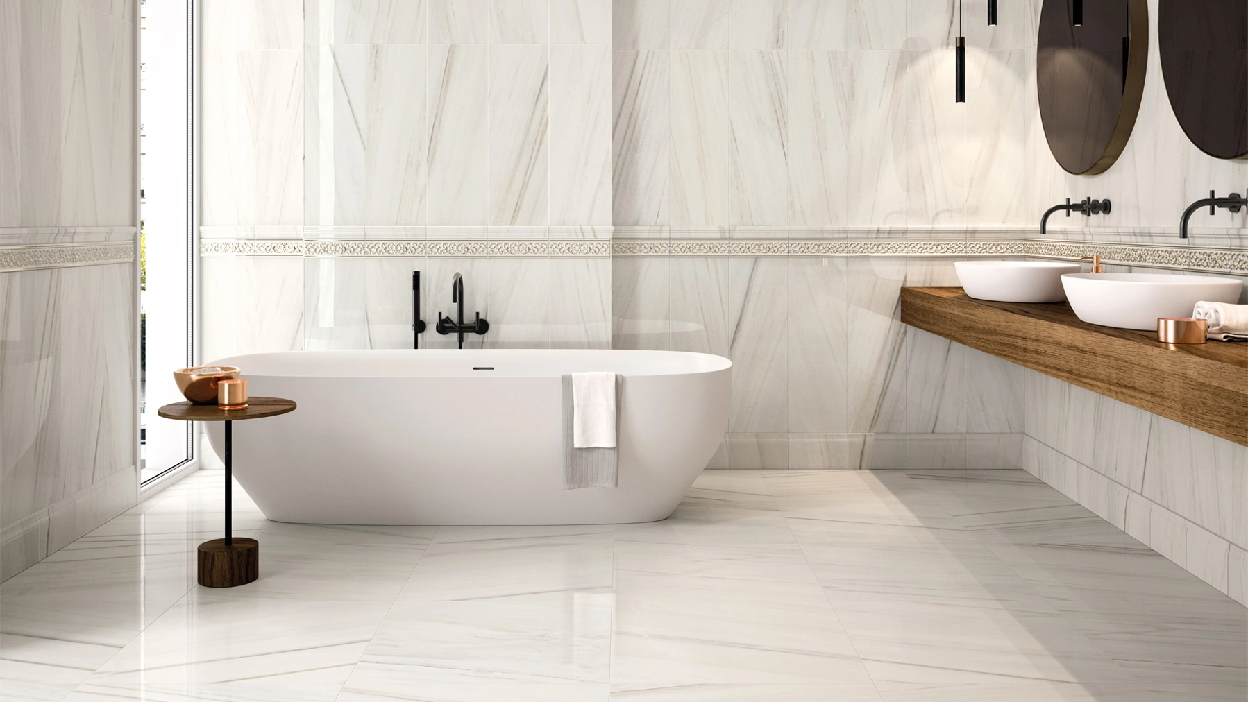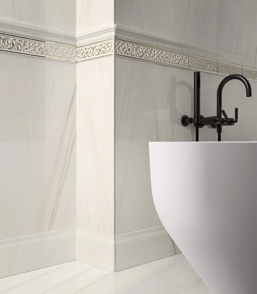 Белый цвет подходит для любого стиля и площади. О практичности беспокоиться не стоит, если в качестве отделочного материала используется плитка. Светлый интерьер ванной комнаты оформлен с помощью керамической настенной плитки в цвете Лаза 25х75 и керамогранита под мрамор Лаза в глянцевой поверхности Люкс. Изысканные однонаправленные прожилки и чистота цвета, присущие одноименному белому мрамору Лаза, придают интерьеру вневременное очарование и современный стиль.