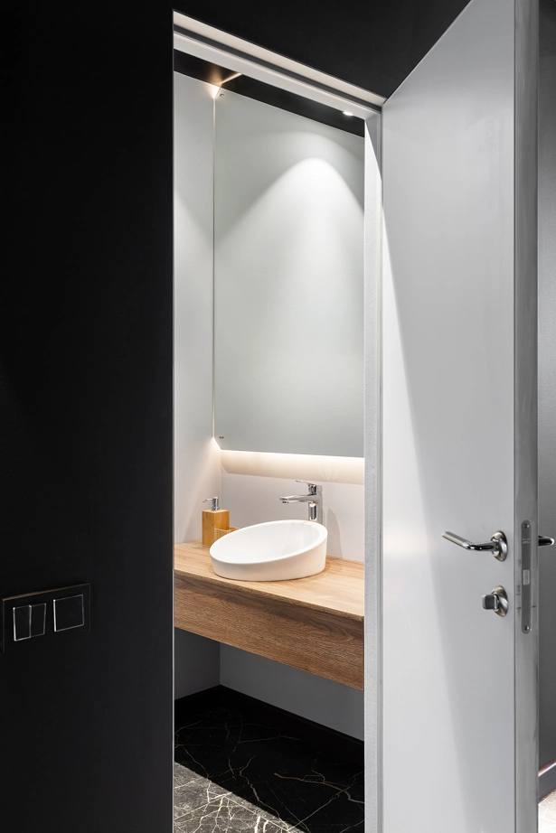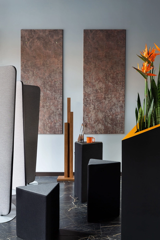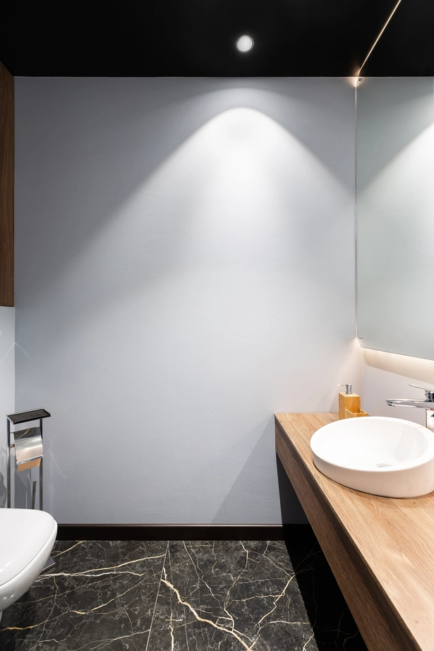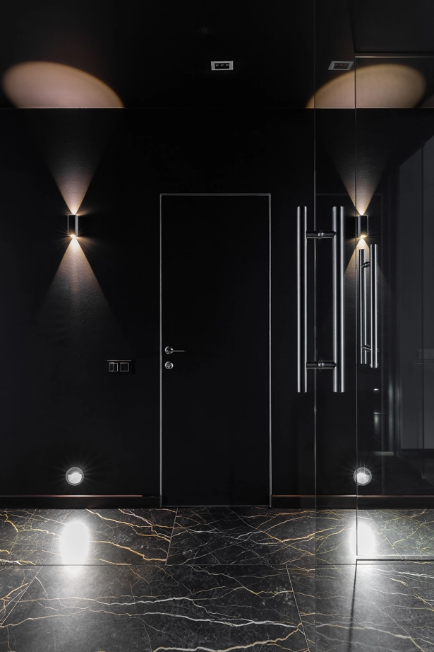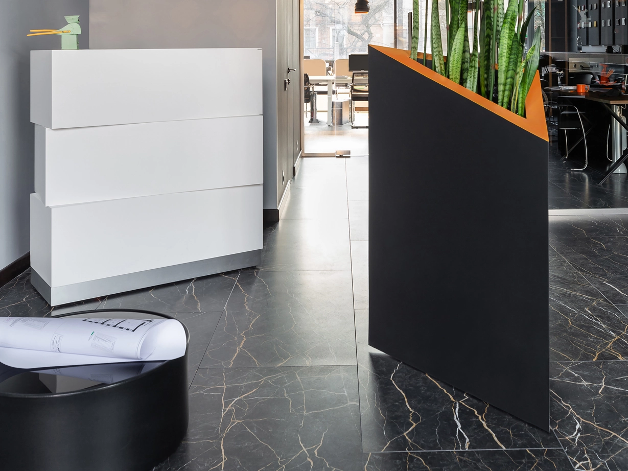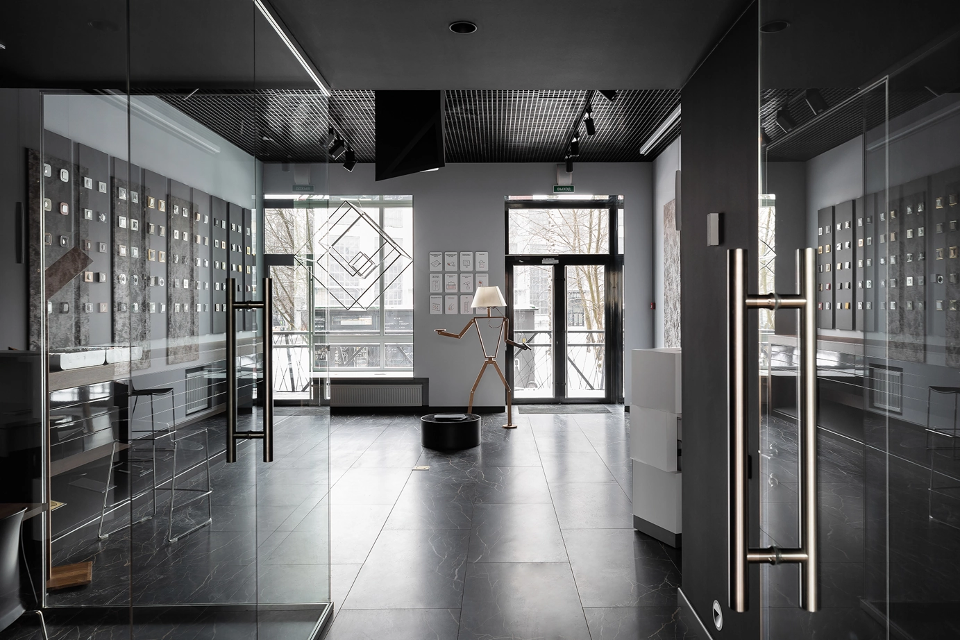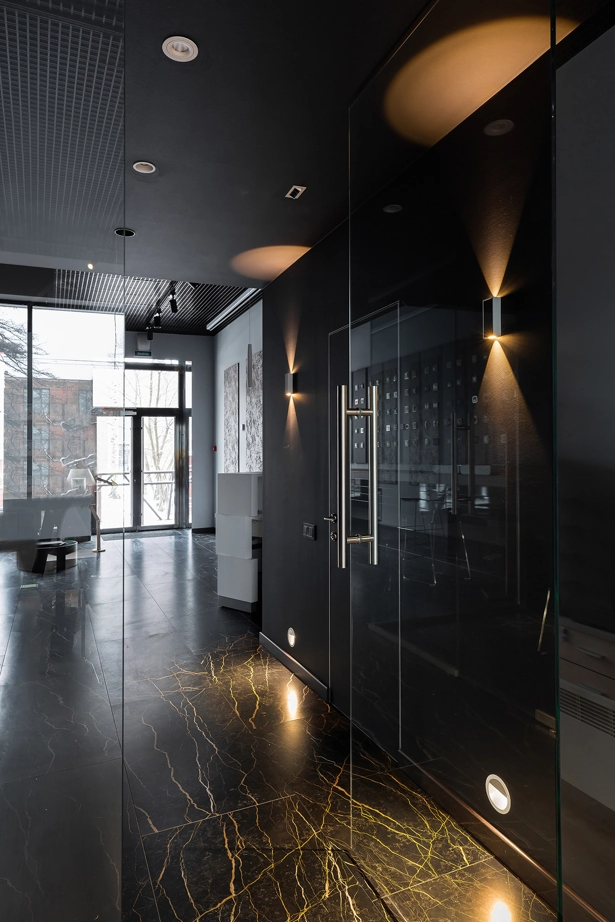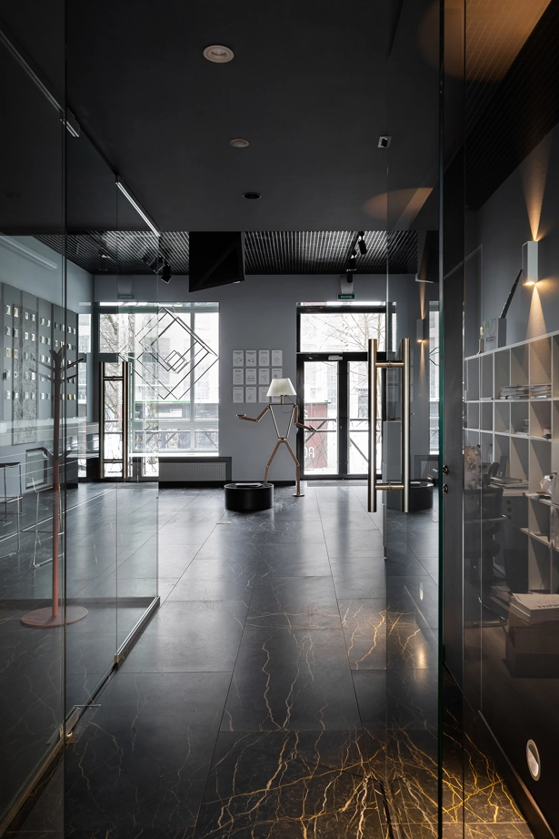Самым подходящим напольным покрытием для всех помещений офиса оказался чёрный с золотыми прожилками керамогранит Charme Extra Laurent. Крупный формат 60x120 в натуральной поверхности отвечает всем требованиям эффектного и долговечного пола.