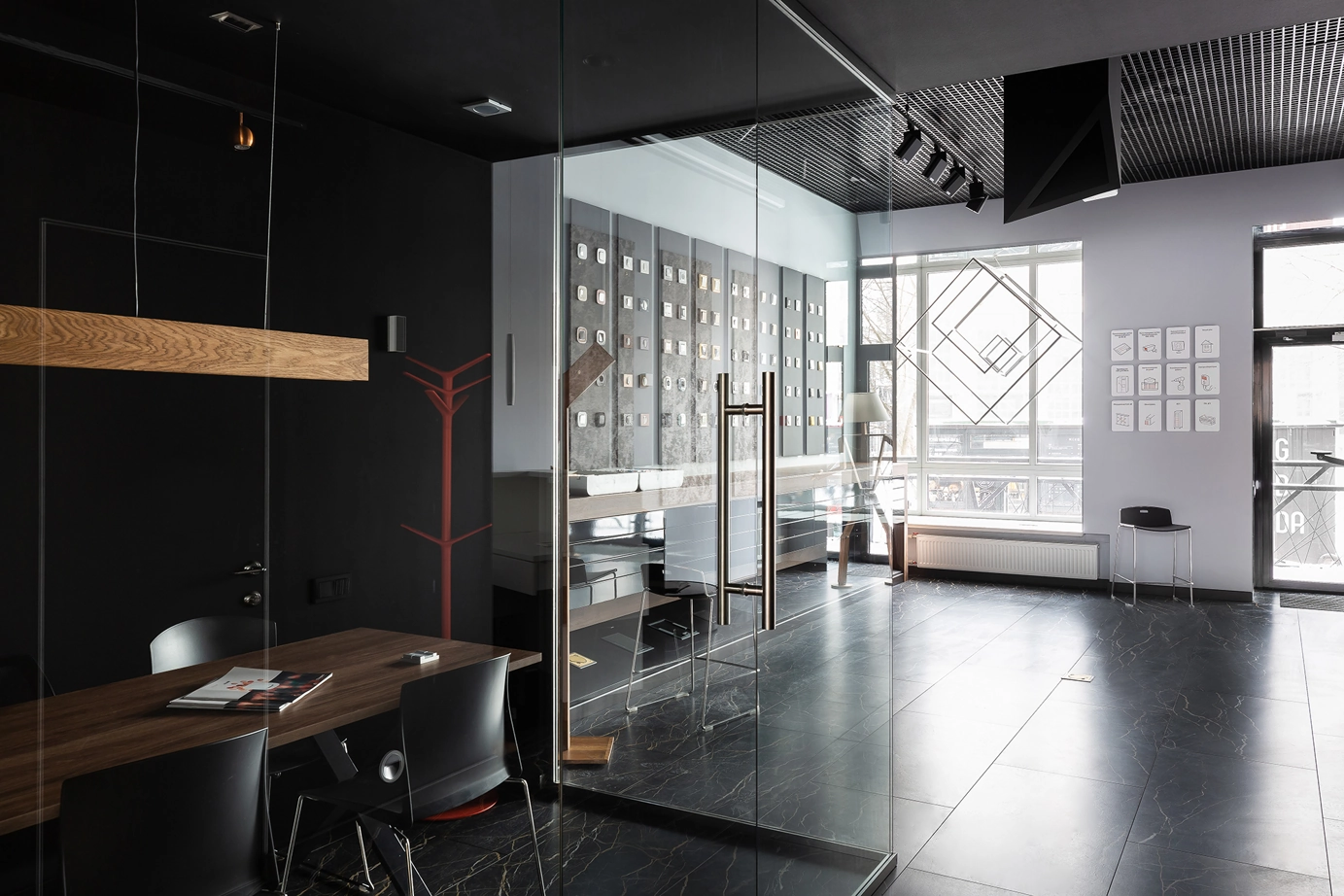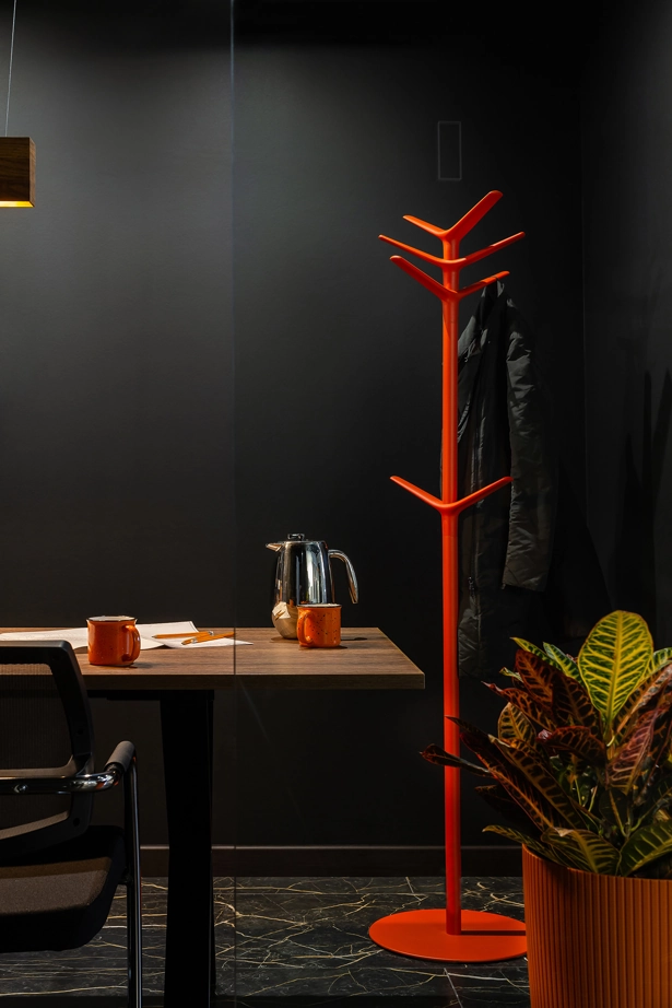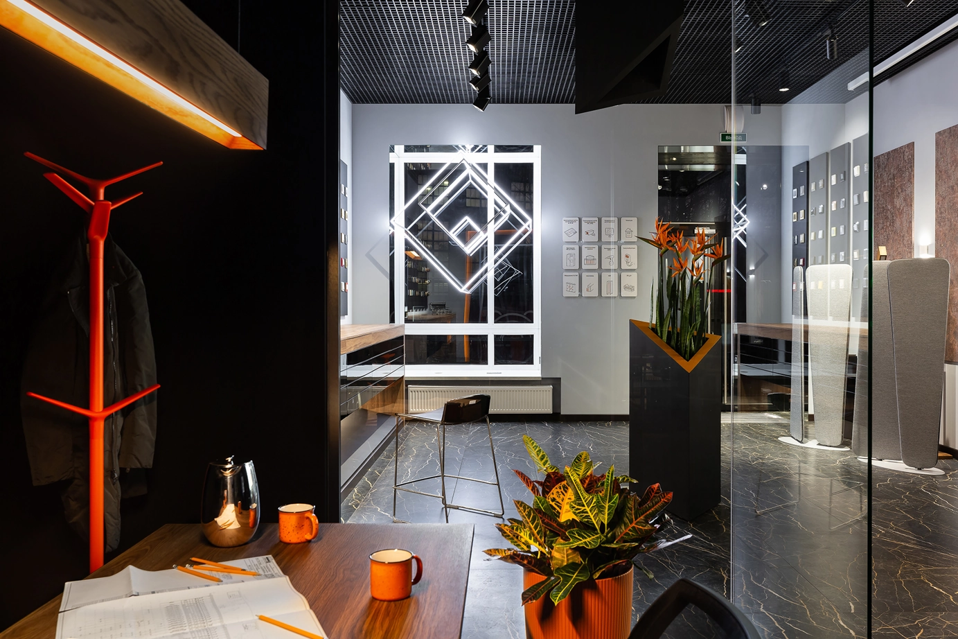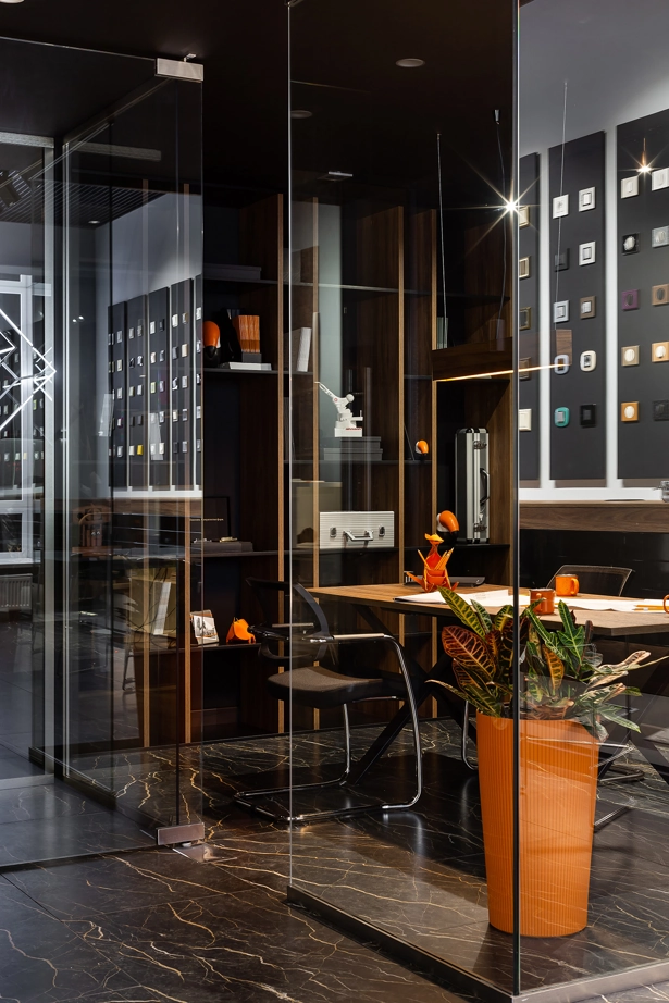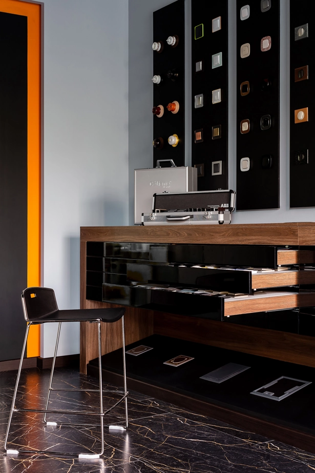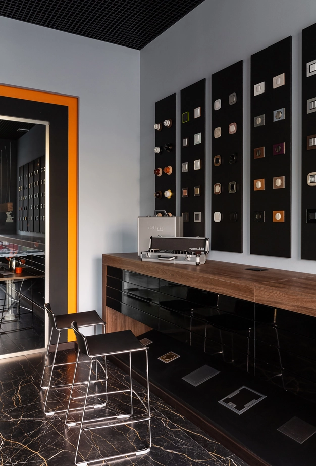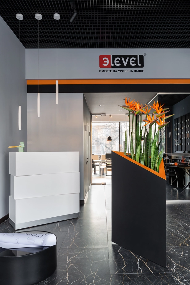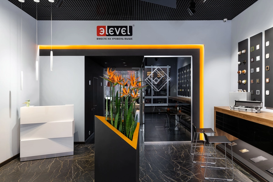 Офис продаж компании Эlevel отличается не только большим выбором электротехнического и светотехнического оборудования, но и стильным дизайнерским интерьером. Отделка выполнена в корпоративных цветах компании – это ахроматические черный, серый и сочный оранжевый.
