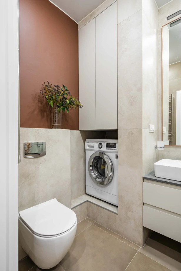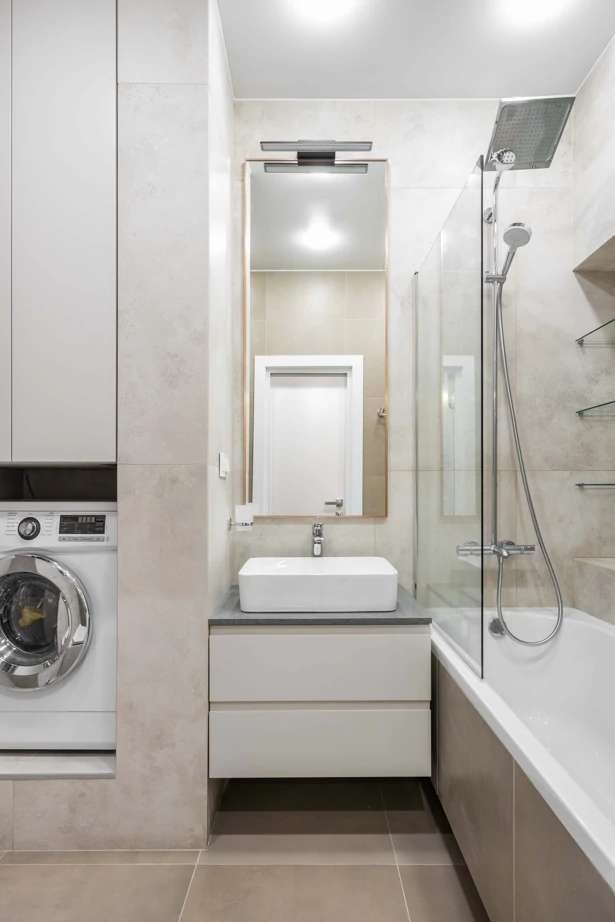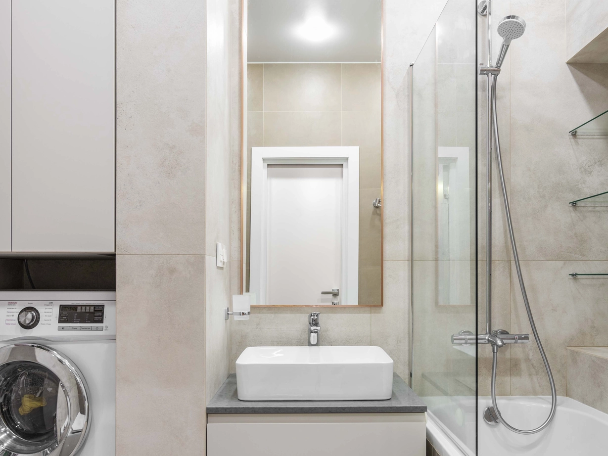 Для оформления ванной комнаты использовали керамогранит под бетон из двух разных коллекций: Millennium Pure 60×120 nat для стен.