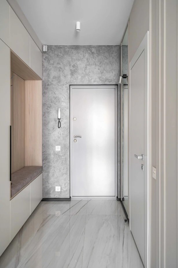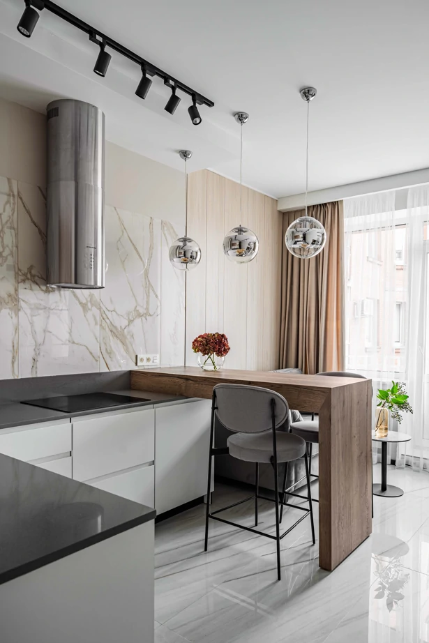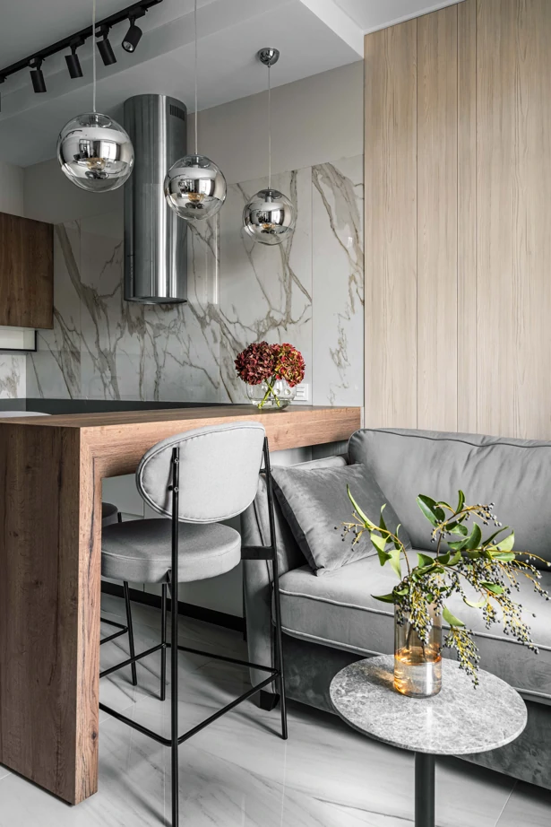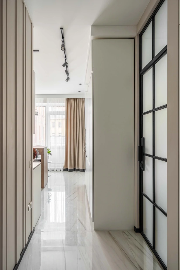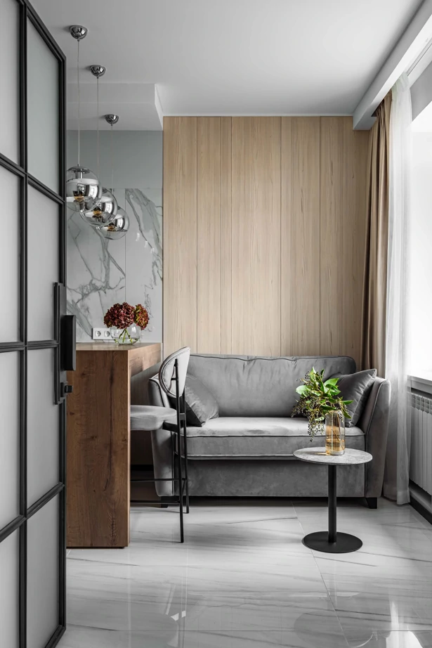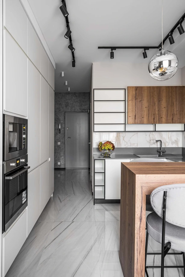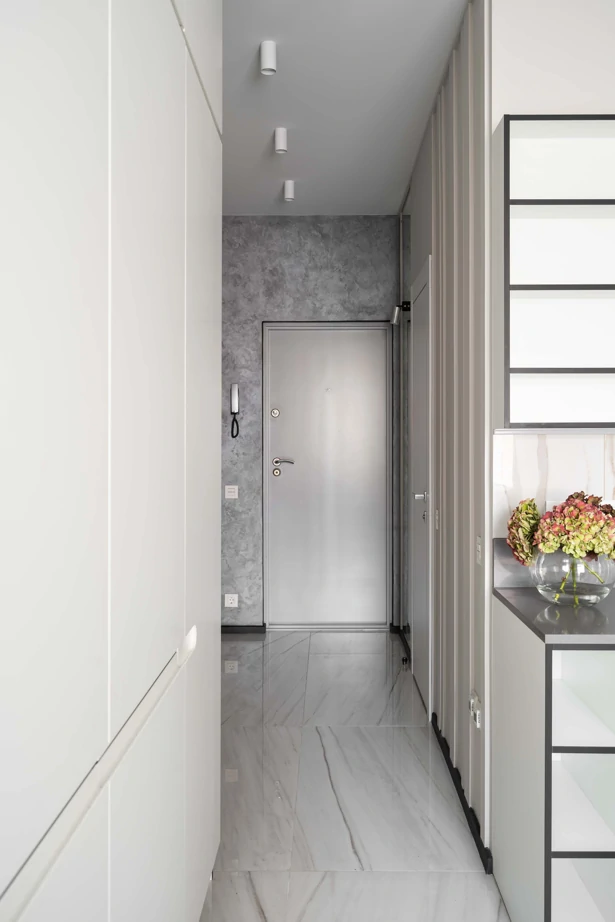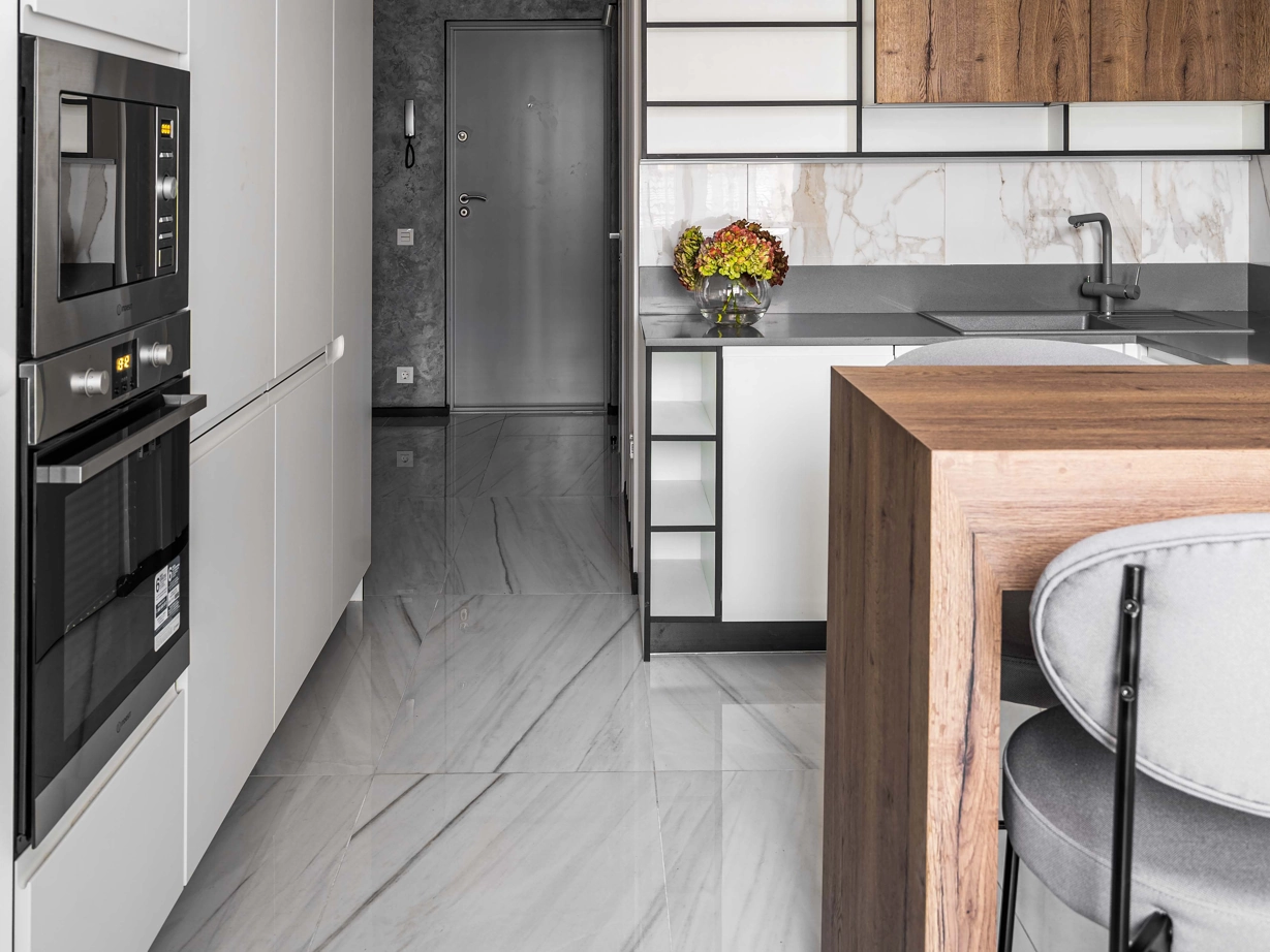 Основу концепции отделки составляет беспроигрышное сочетание текстур мрамора, дерева, металла и бетона в выверенной пропорции. В прихожей и кухне-гостиной сделали единый светлый глянцевый пол в керамограните Charme Extra Lasa 60×120 lux, что позволило визуально увеличить помещение.