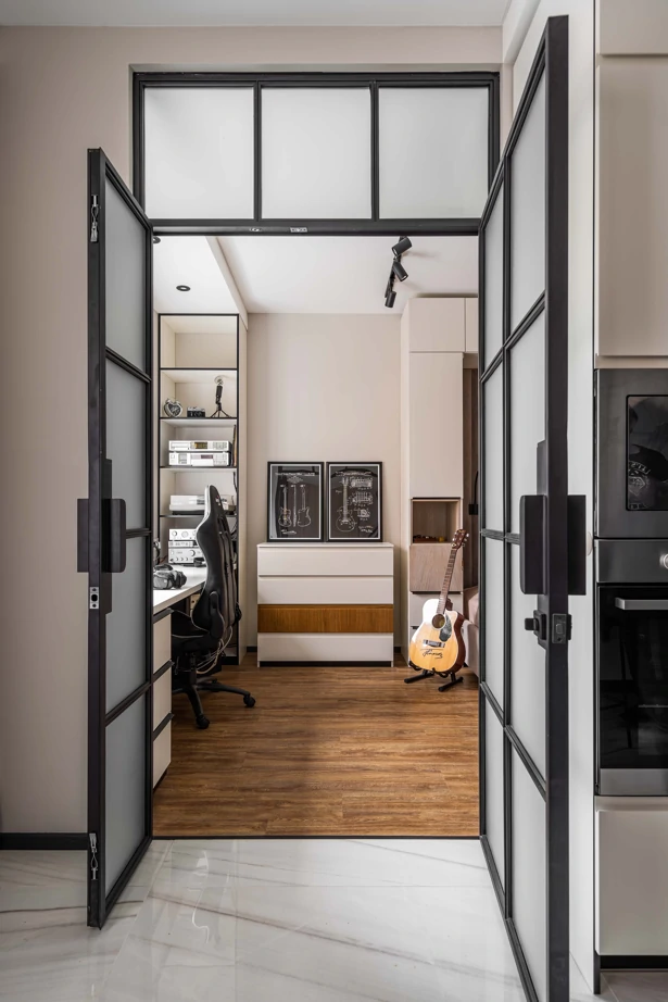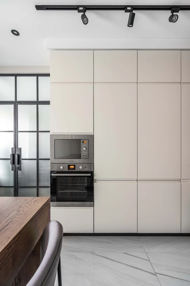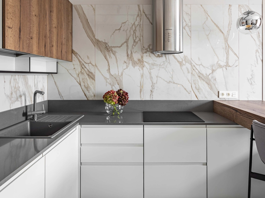 Стены над кухней облицованы также плиткой под мрамор Charme Evo Calacatta 60×120 в зеркальной поверхности lux и почти свободны от шкафов, поскольку пеналов для хранения более, чем достаточно. Торцы фасадов окрашены в черный цвет – для графики. Очень интересный, современный и бюджетный прием, который стоит взять на заметку.