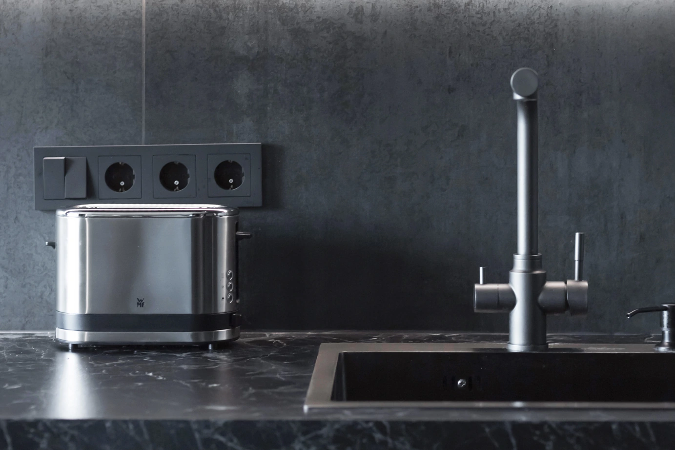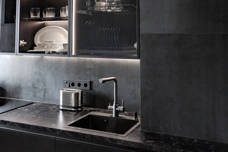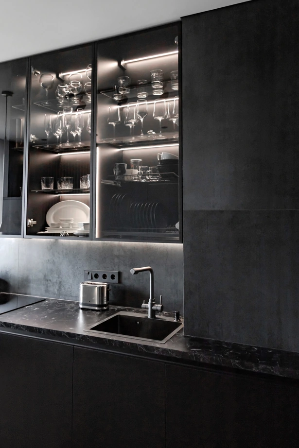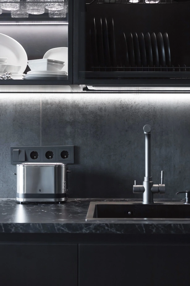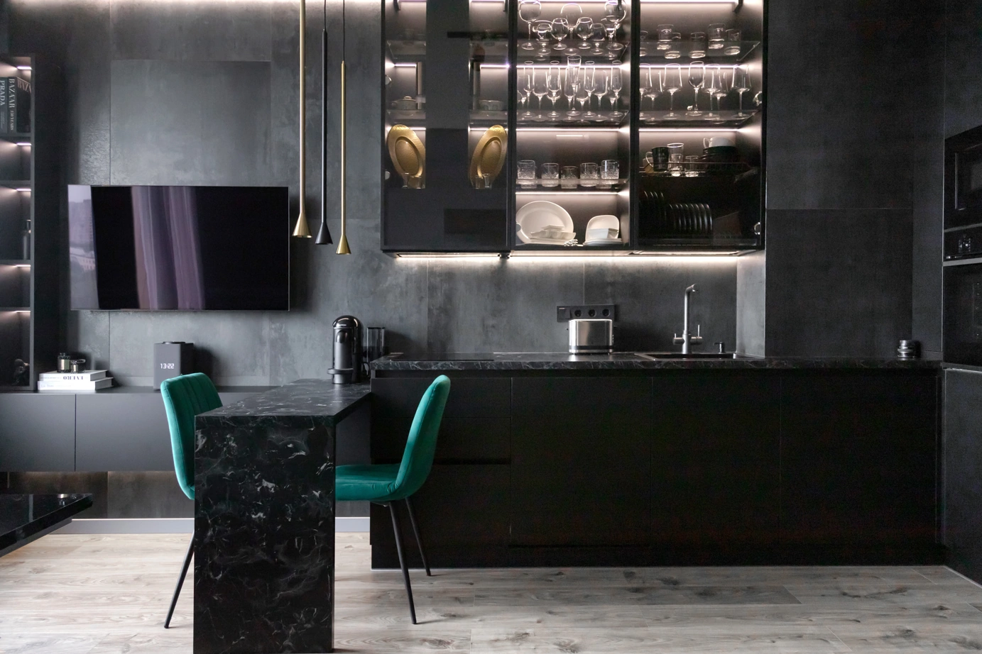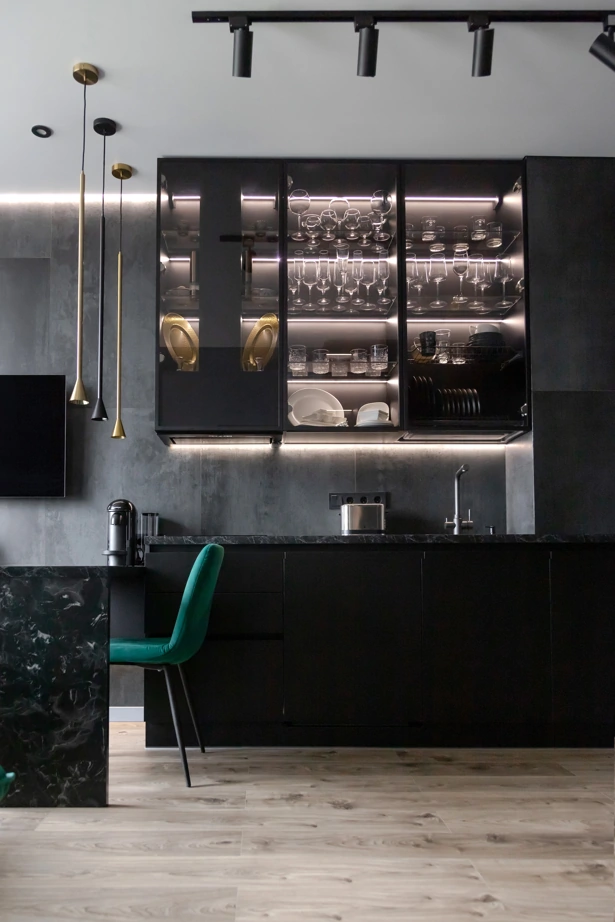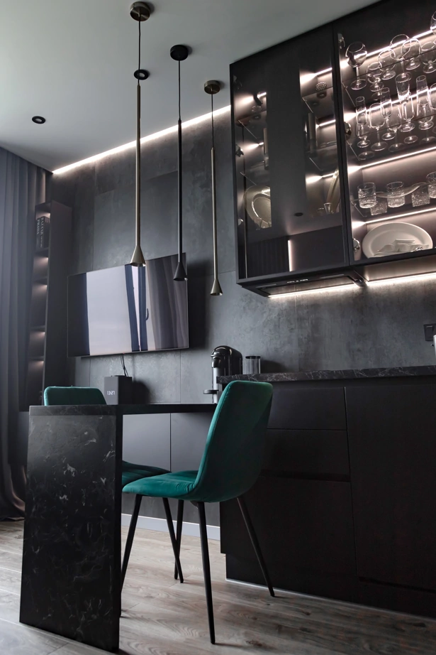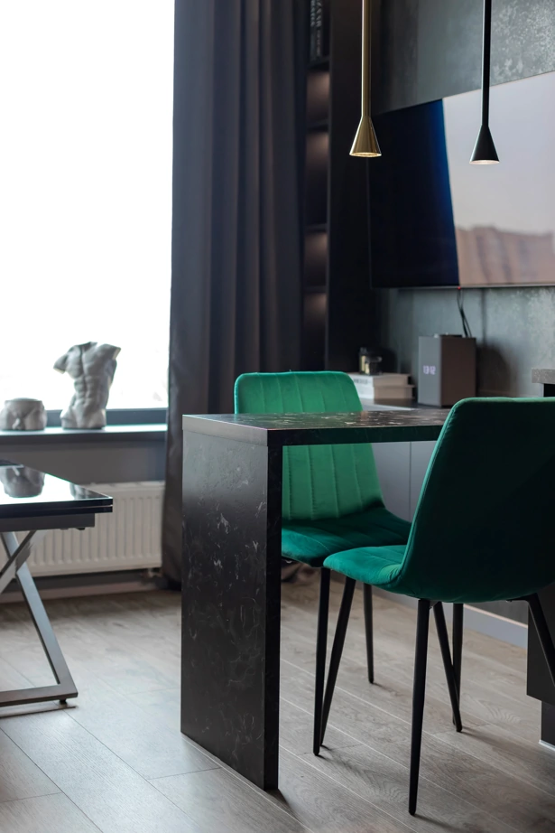 Это позволило использовать для отделки крупноформатный керамогранит Steel 80x160 и в полной мере продемонстрировать эффектную текстуру вороненой стали из коллекции Surface. Темная плитка под металл задает тон всему интерьеру и гармонично сочетается с черной кухней и даже домашним питомцем, а изумрудный диван и барные стулья выигрышно выделаются на их фоне.