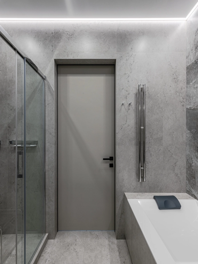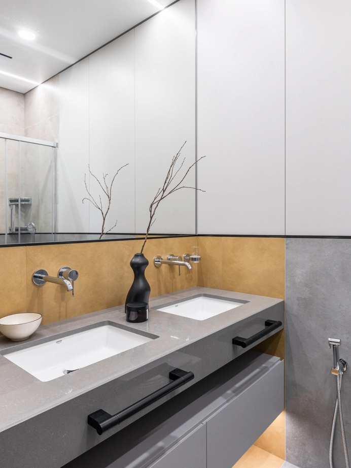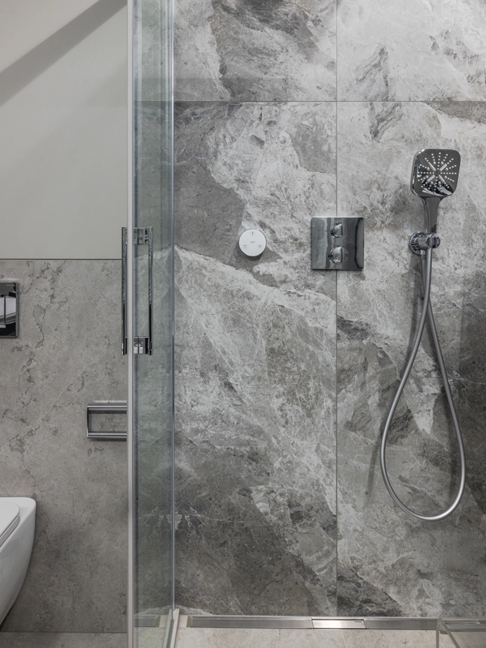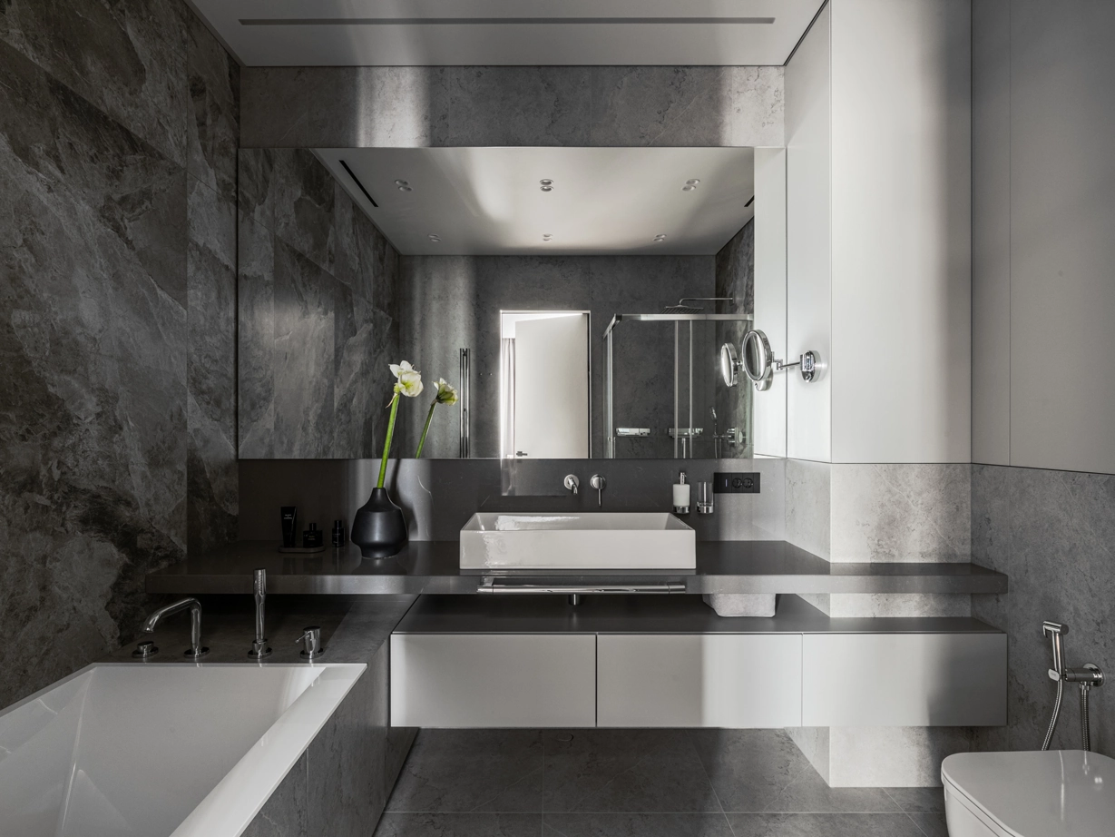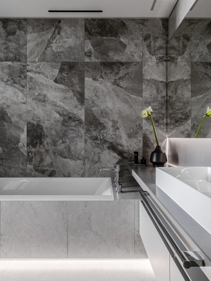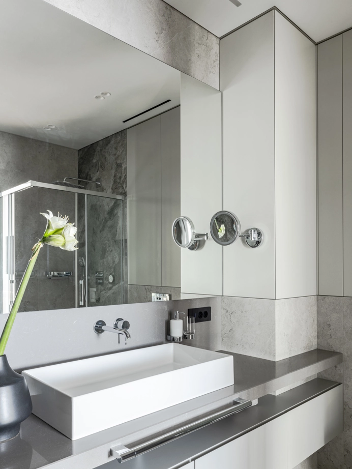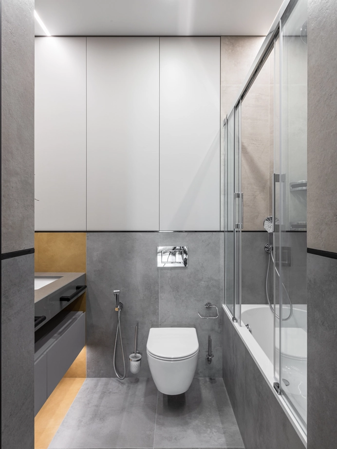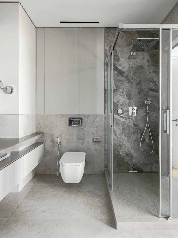 Проект уютной квартиры с лаконичным дизайном в серых тонах отличается современным дизайном и элегантностью. В ванной комнате использован керамогранит под мрамор Шарм Экстра Сильвер на стенах в душевой, который придает изысканный вид. Нейтральный серый оттенок Метрополис Абсолют Сильвер на полу и стенах гармонично дополняет интерьер, подчеркивая чистоту линий и создавая ощущение спокойствия. Во втором санузле в качестве яркого акцента использована цветная настенная плитка Терравива Сенапэ 40x80, который добавляет динамики в общий дизайн, сохраняя при этом стильную эстетику.