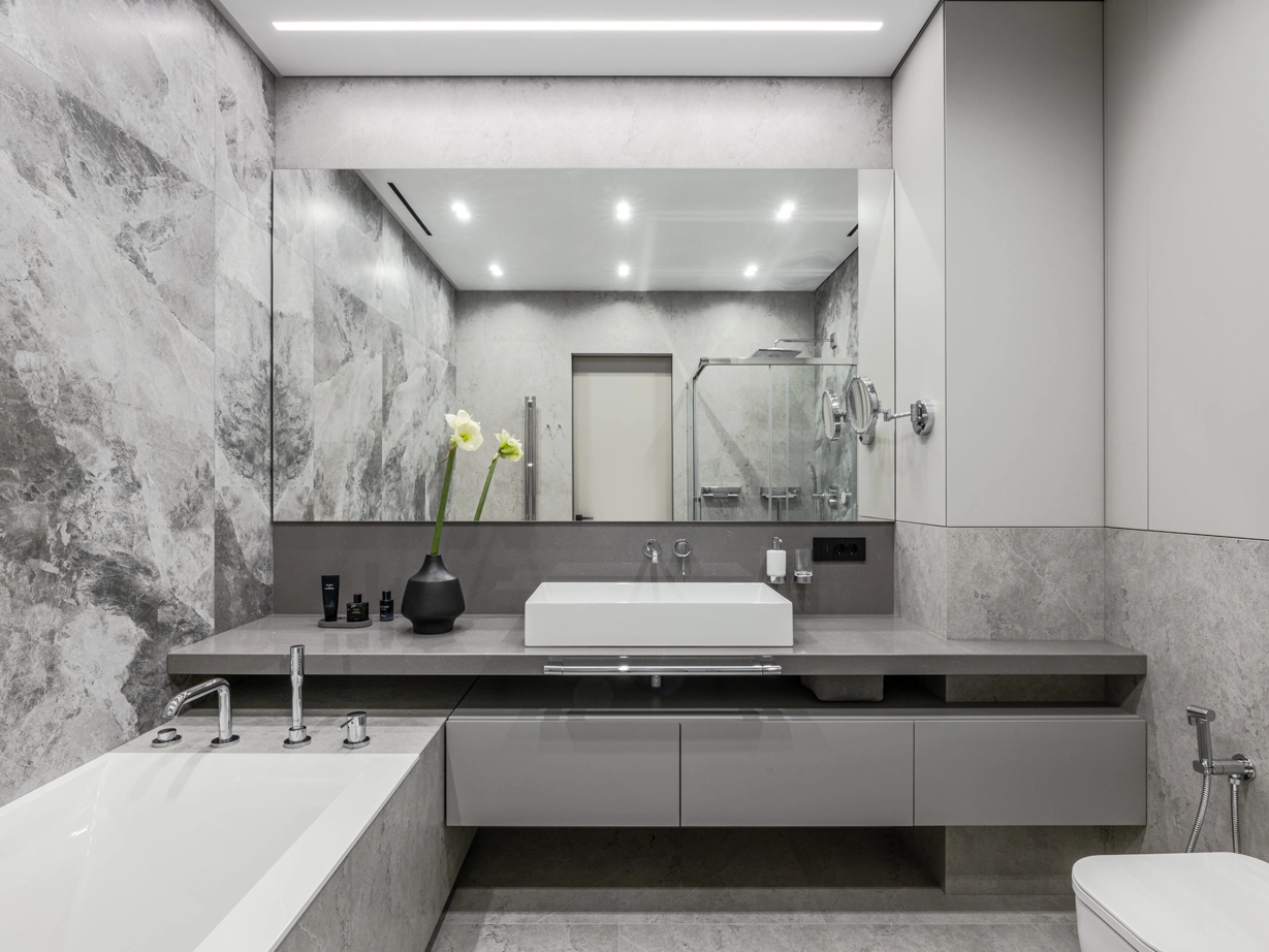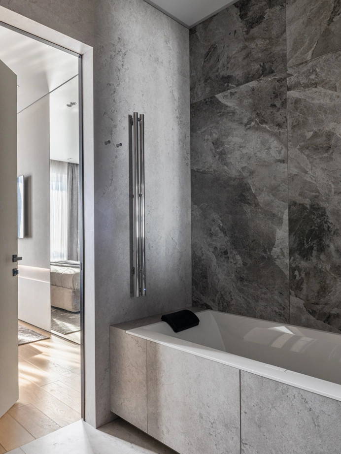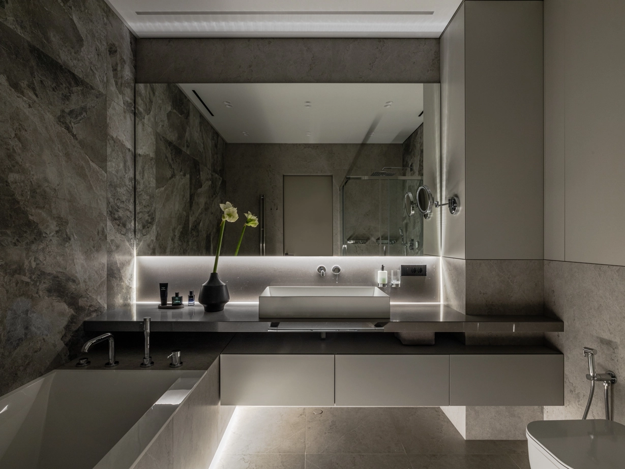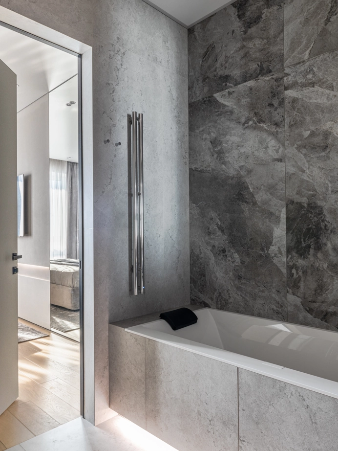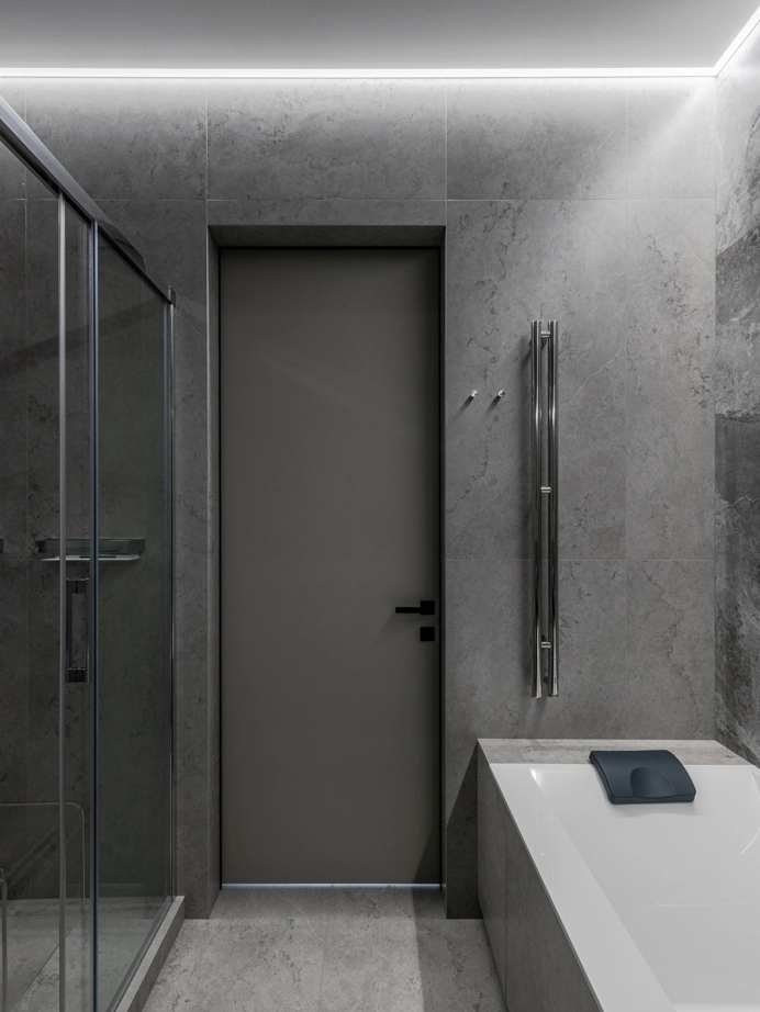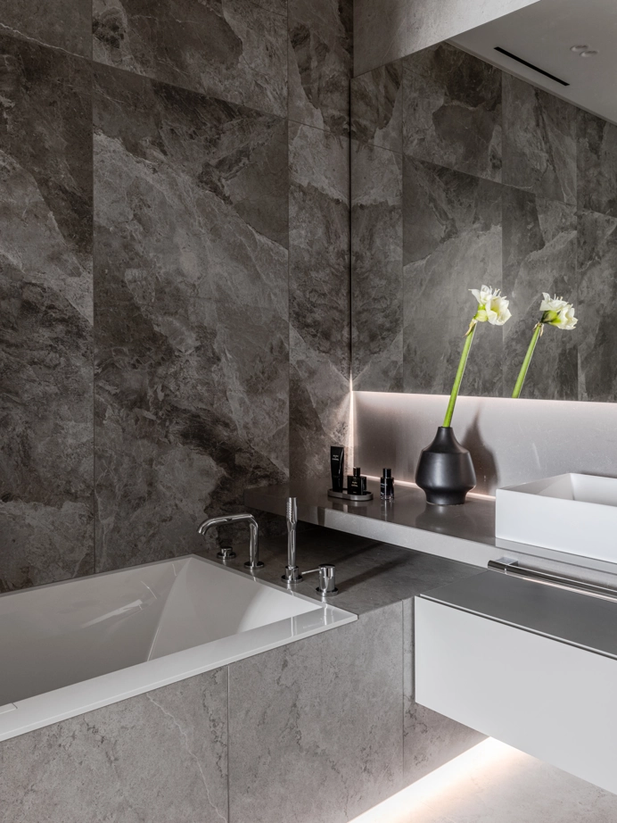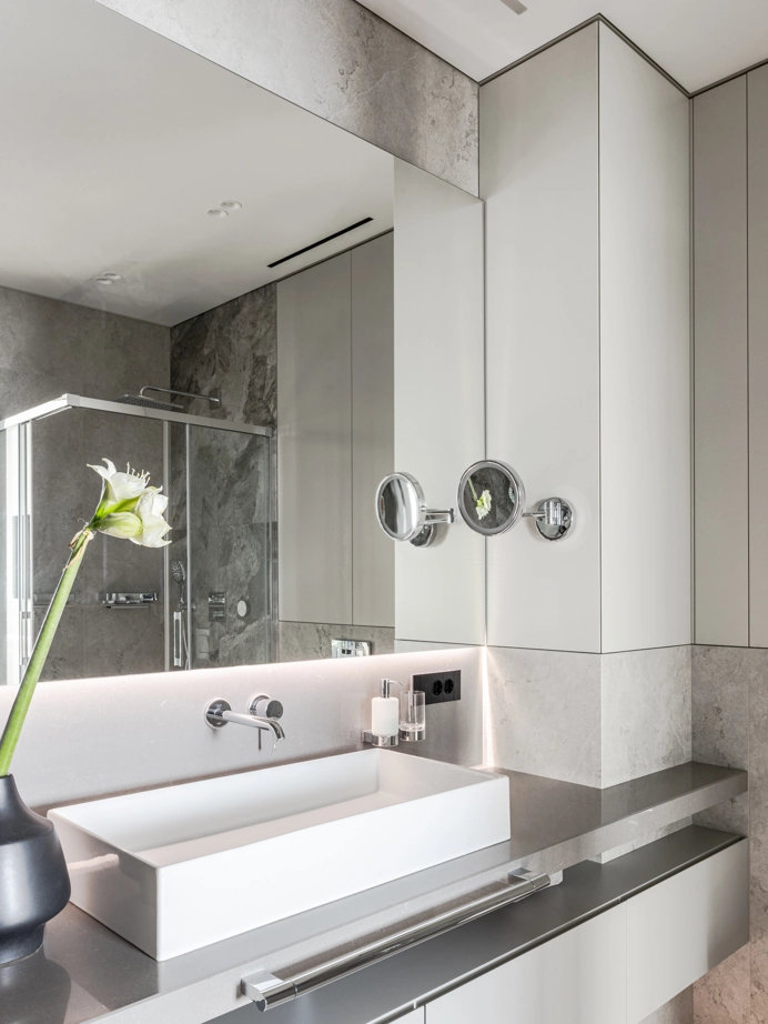Проект уютной квартиры с лаконичным дизайном в серых тонах отличается современным дизайном и элегантностью. В ванной комнате использован керамогранит под мрамор Шарм Экстра Сильвер на стенах в душевой, который придает изысканный вид. Нейтральный серый оттенок Метрополис Абсолют Сильвер на полу и стенах гармонично дополняет интерьер, подчеркивая чистоту линий и создавая ощущение спокойствия. Во втором санузле в качестве яркого акцента использована цветная настенная плитка Терравива Сенапэ 40x80, который добавляет динамики в общий дизайн, сохраняя при этом стильную эстетику.