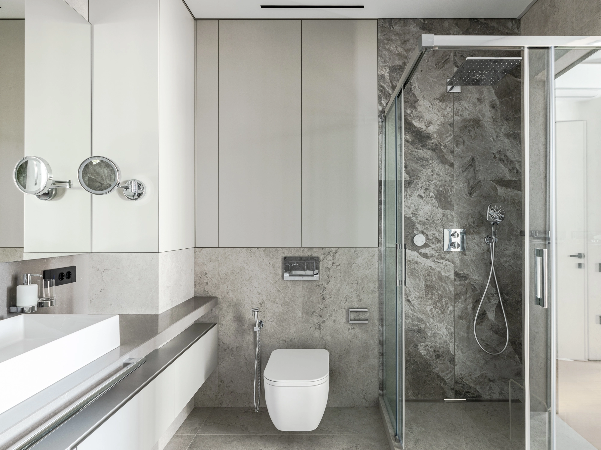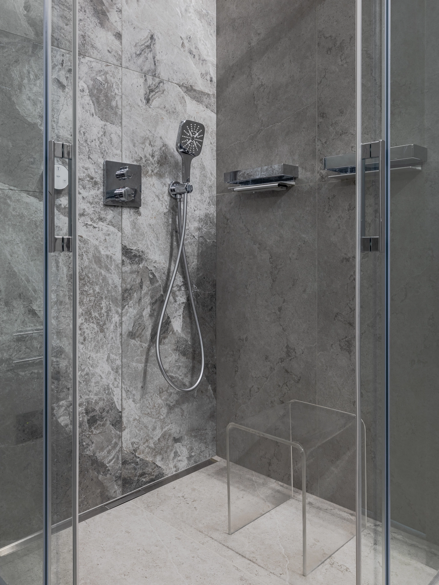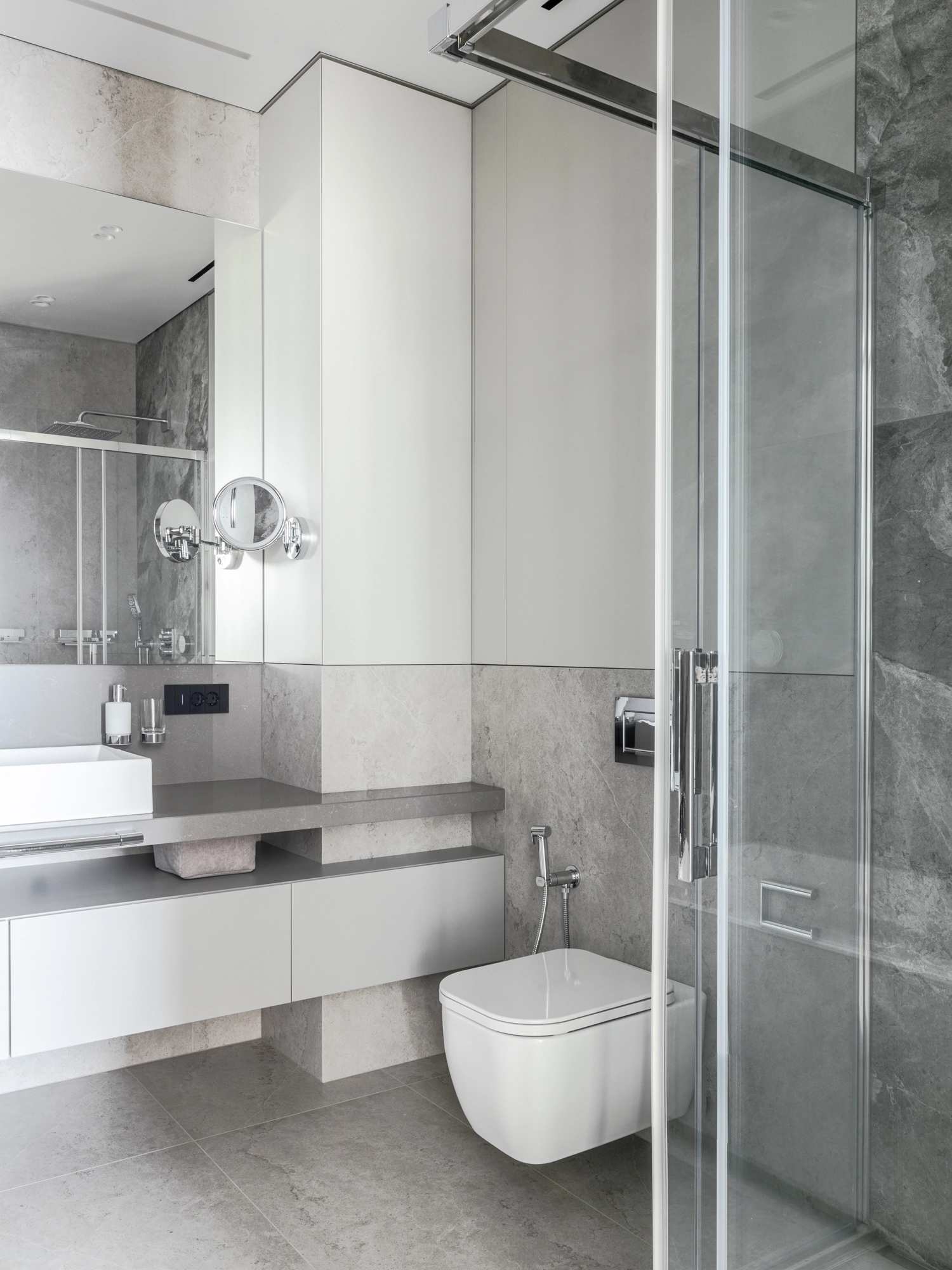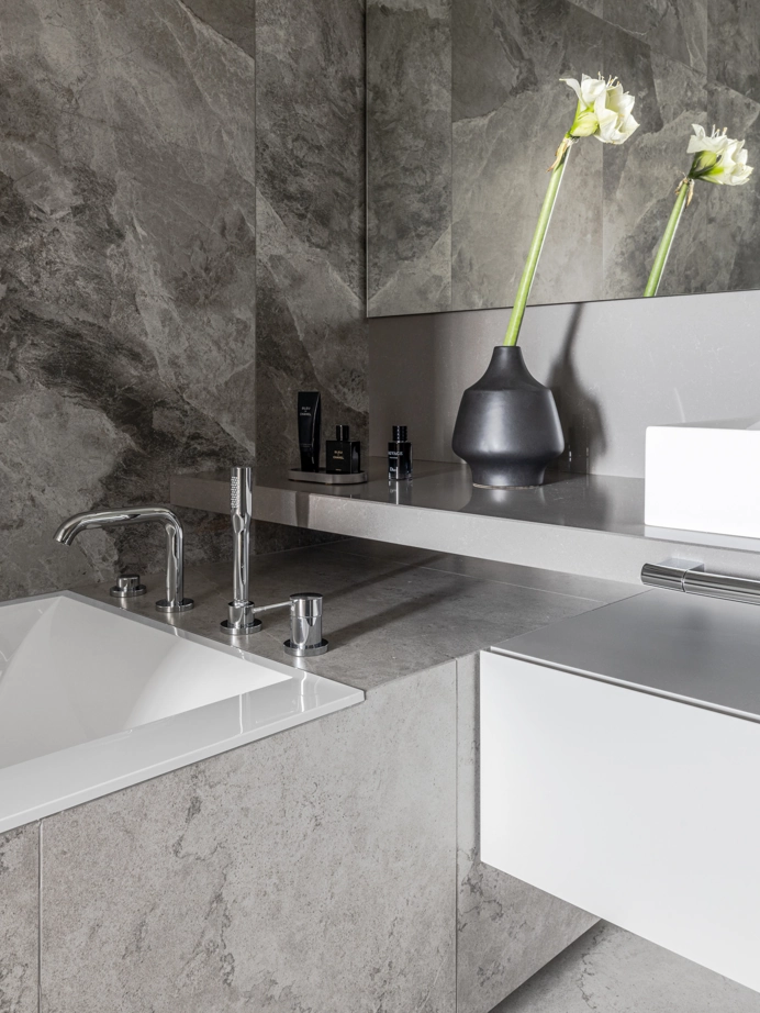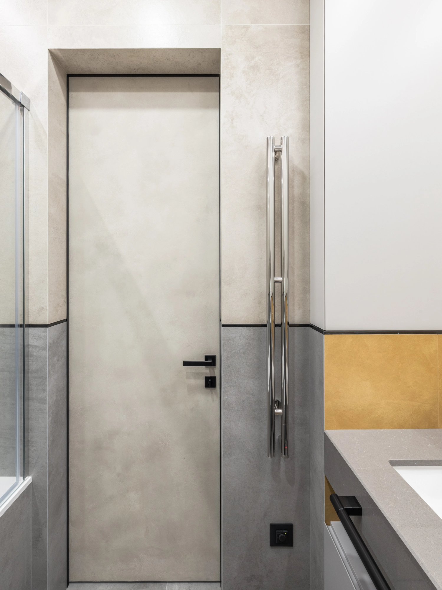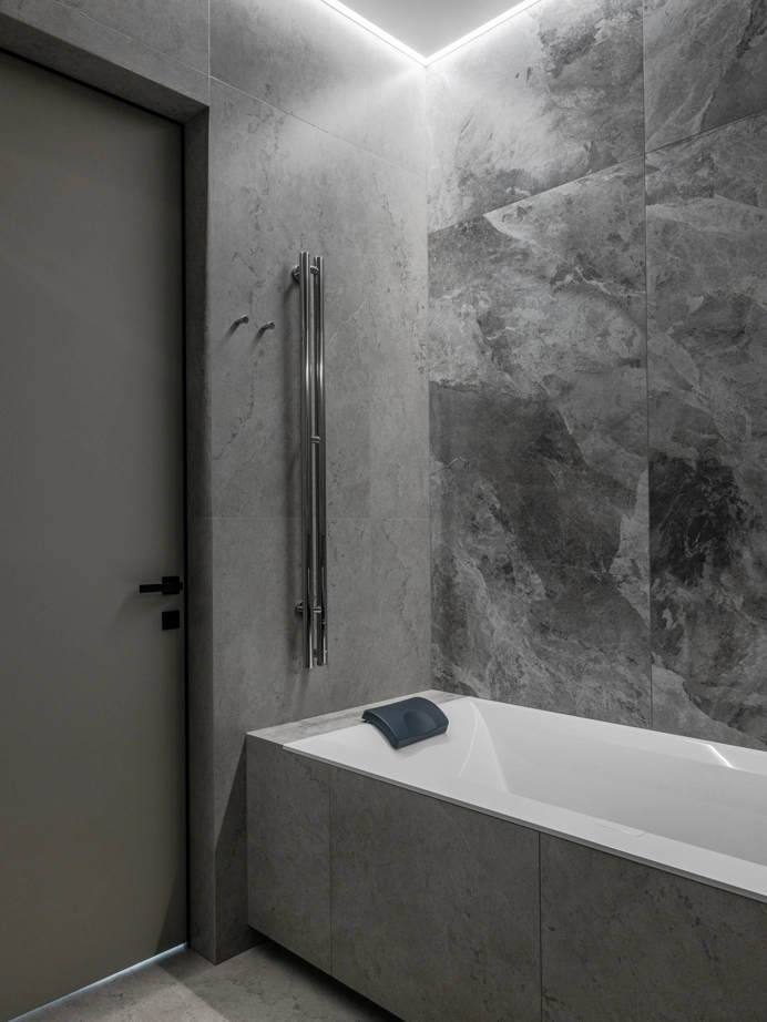 Проект уютной квартиры с лаконичным дизайном в серых тонах отличается современным дизайном и элегантностью. В ванной комнате использован керамогранит под мрамор Шарм Экстра Сильвер на стенах в душевой, который придает изысканный вид. Нейтральный серый оттенок Метрополис Абсолют Сильвер на полу и стенах гармонично дополняет интерьер, подчеркивая чистоту линий и создавая ощущение спокойствия. Во втором санузле в качестве яркого акцента использована цветная настенная плитка Терравива Сенапэ 40x80, который добавляет динамики в общий дизайн, сохраняя при этом стильную эстетику.