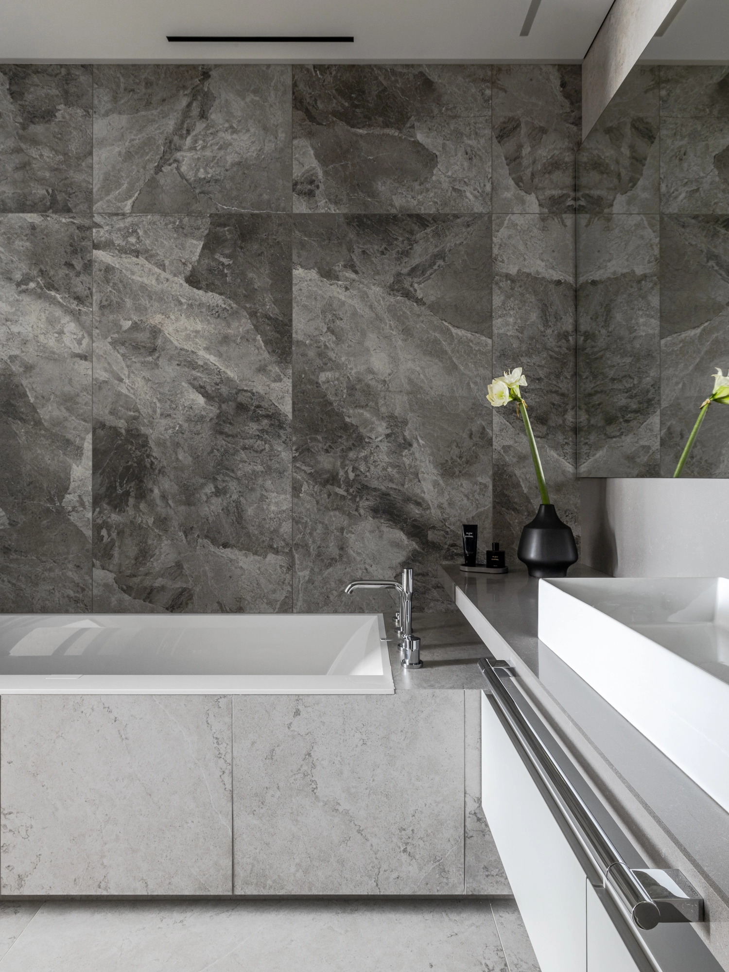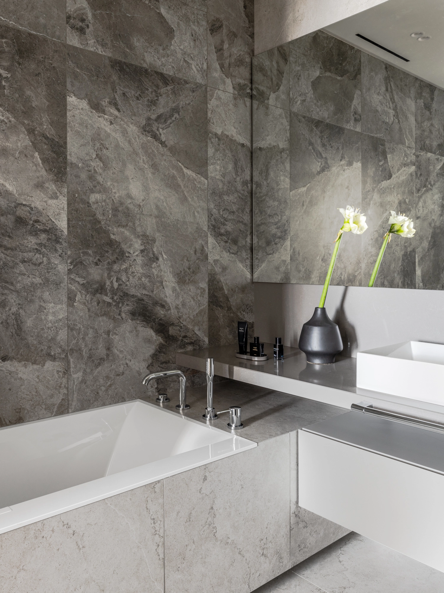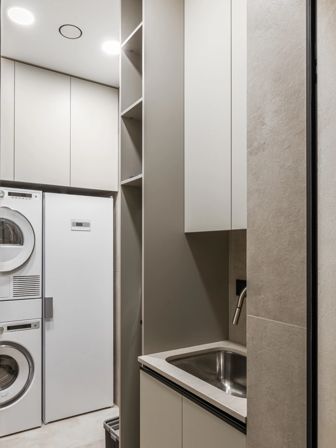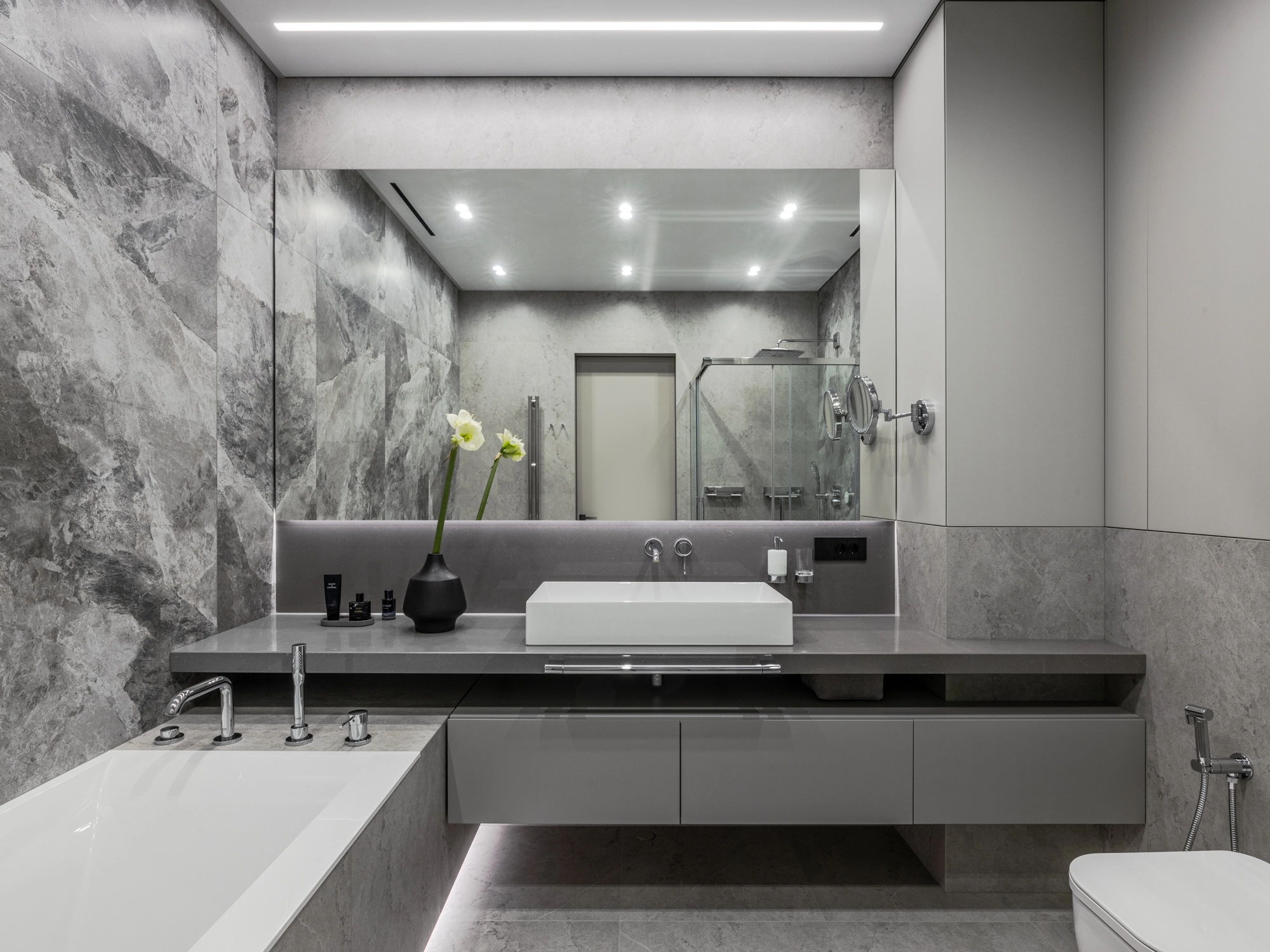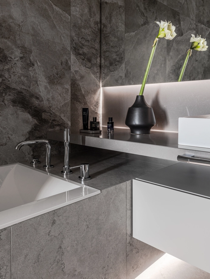 Проект уютной квартиры с лаконичным дизайном в серых тонах отличается современным дизайном и элегантностью. В ванной комнате использован керамогранит под мрамор Шарм Экстра Сильвер на стенах в душевой, который придает изысканный вид. Нейтральный серый оттенок Метрополис Абсолют Сильвер на полу и стенах гармонично дополняет интерьер, подчеркивая чистоту линий и создавая ощущение спокойствия. Во втором санузле в качестве яркого акцента использована цветная настенная плитка Терравива Сенапэ 40x80, который добавляет динамики в общий дизайн, сохраняя при этом стильную эстетику.