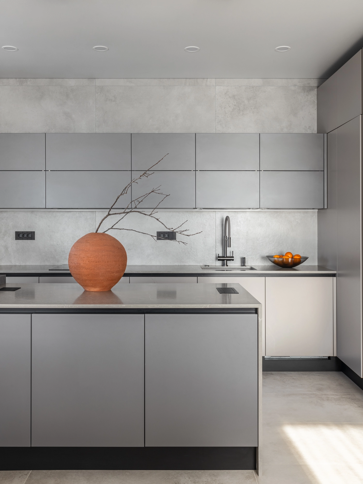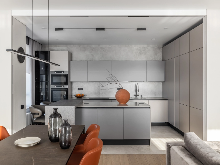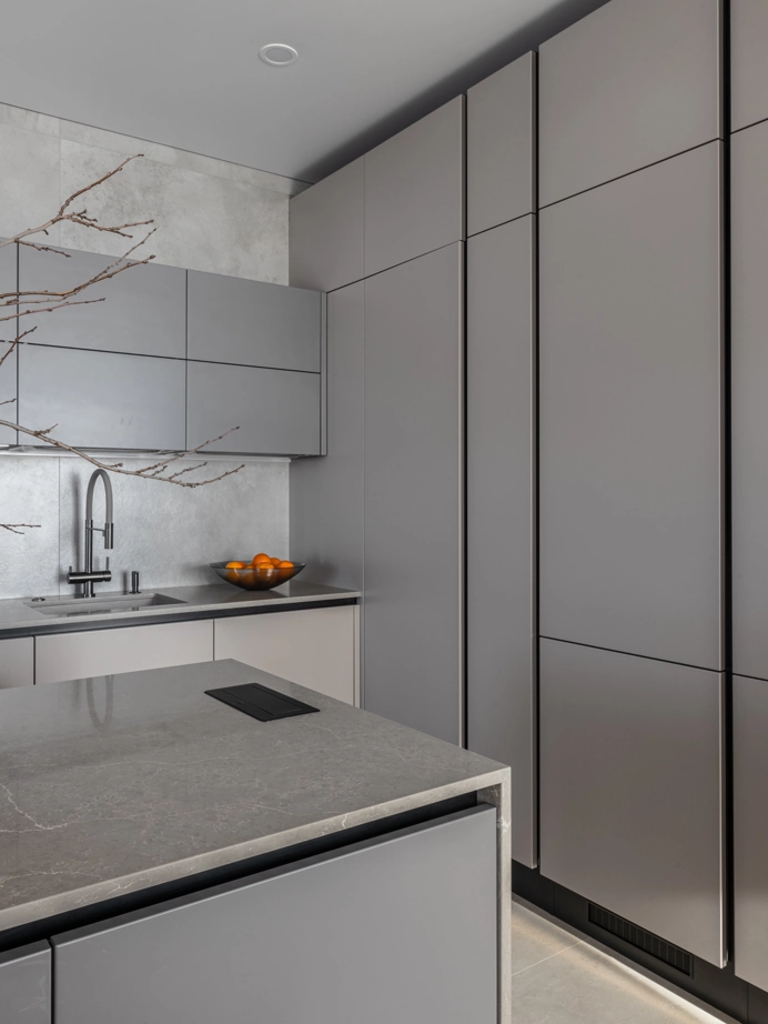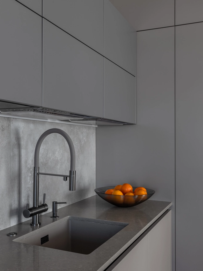 На кухонном фартуке керамогранит Миллениум Сильвер придает кухне современный вид, а его оттенок отлично сочетается со всеми элементами интерьера.